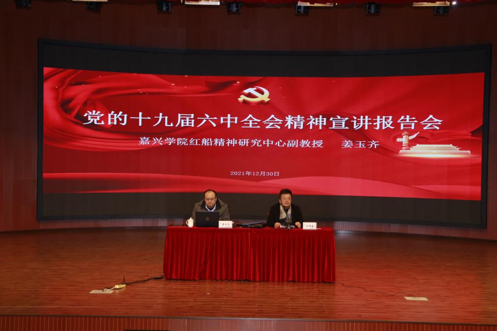 12月30日下午,党的十九届六中全会精神宣讲报告会在平湖校区行政楼报告厅举行。校宣讲团成员,教育部人文社科重点研究基地嘉兴公司红船精神研究中心博士、副教授姜玉其作专题宣讲报告。公司副经理王明建主持报告会。