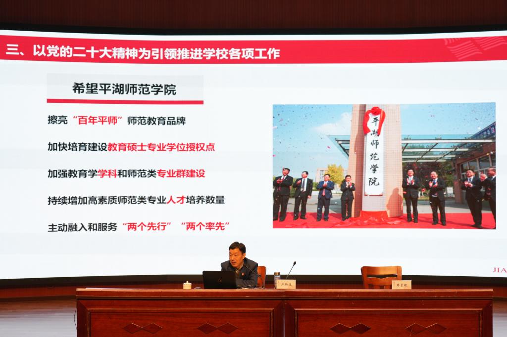 他希望公司要以党的二十大精神为指引,坚持办学正确政治方向,坚守为党育人、为国育才,进一步擦亮“百年平师”师范教育品牌,加快培育建设教育硕士专业学位授权点,加强教育学学科和师范类专业群建设,持续增加地方经济社会发展急需的高素质师范类专业人才培养数量,全面提高人才引育和自主培养质量,主动融入和服务“两个先行”“两个率先”踔厉奋发、实干争先,在中国式现代化新征程中展现新担当、新作为。