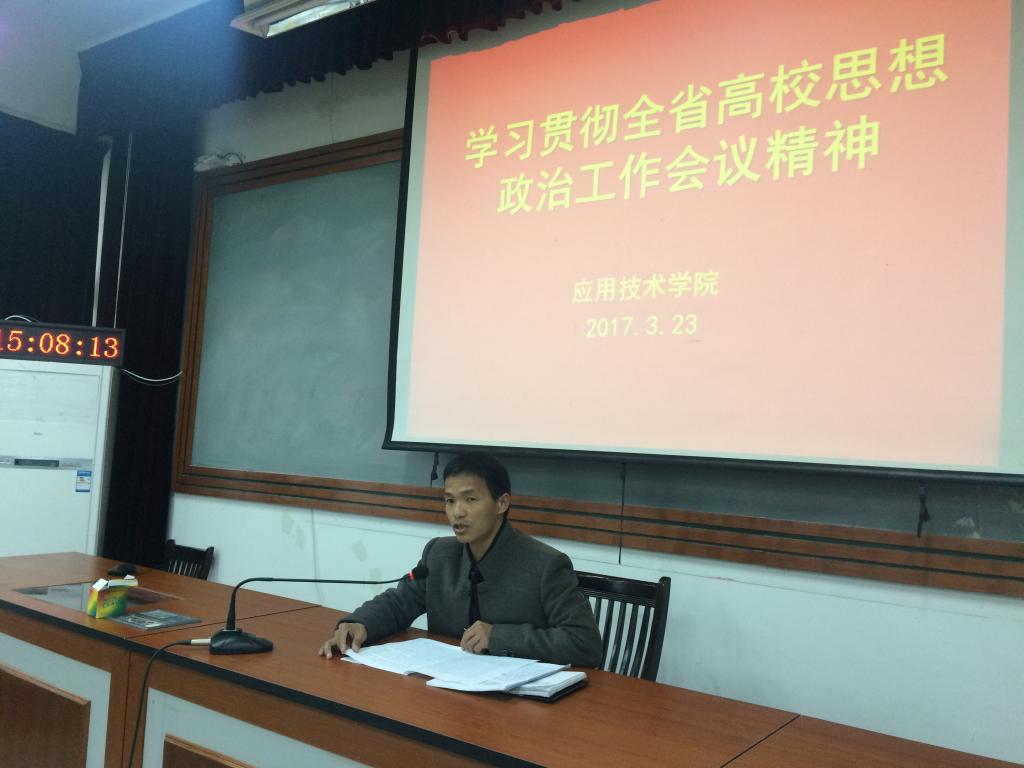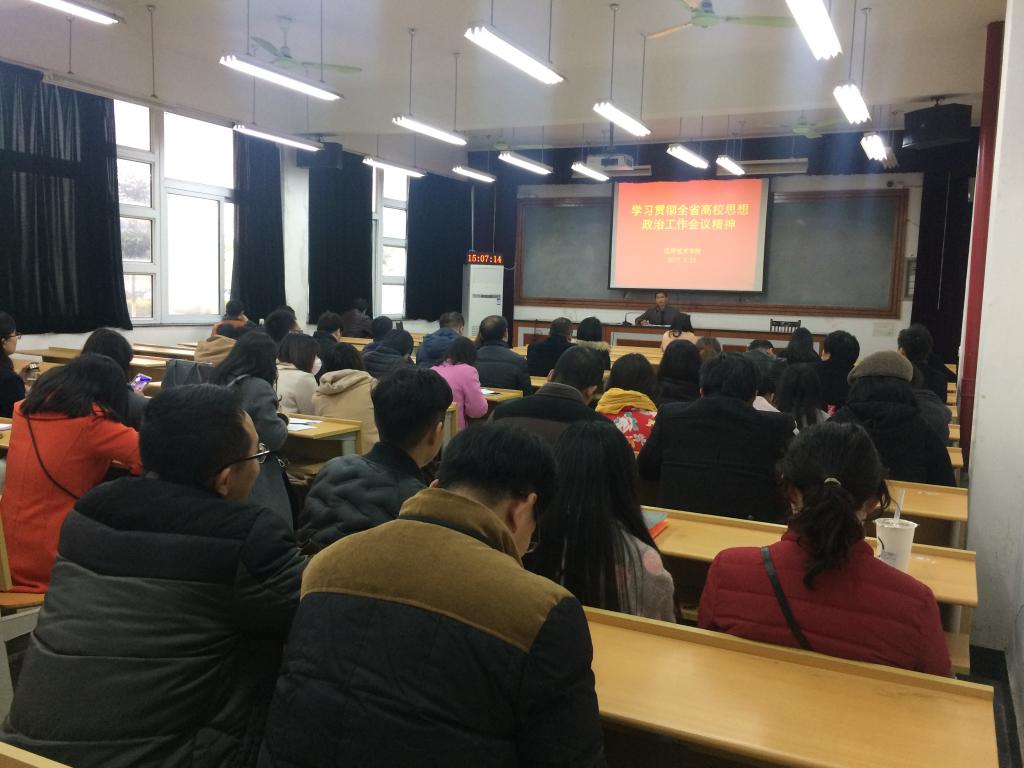 3月23日下午,应用技术公司党总支在平湖校区多媒体三传达学习全省高校思想政治工作会议精神。党总支副书记冯伟芳主持会议并讲话,强调要深入贯彻落实全国、全省高校思想政治工作会议精神,扎实推进公司思想政治工作。全体教职工参加会议。