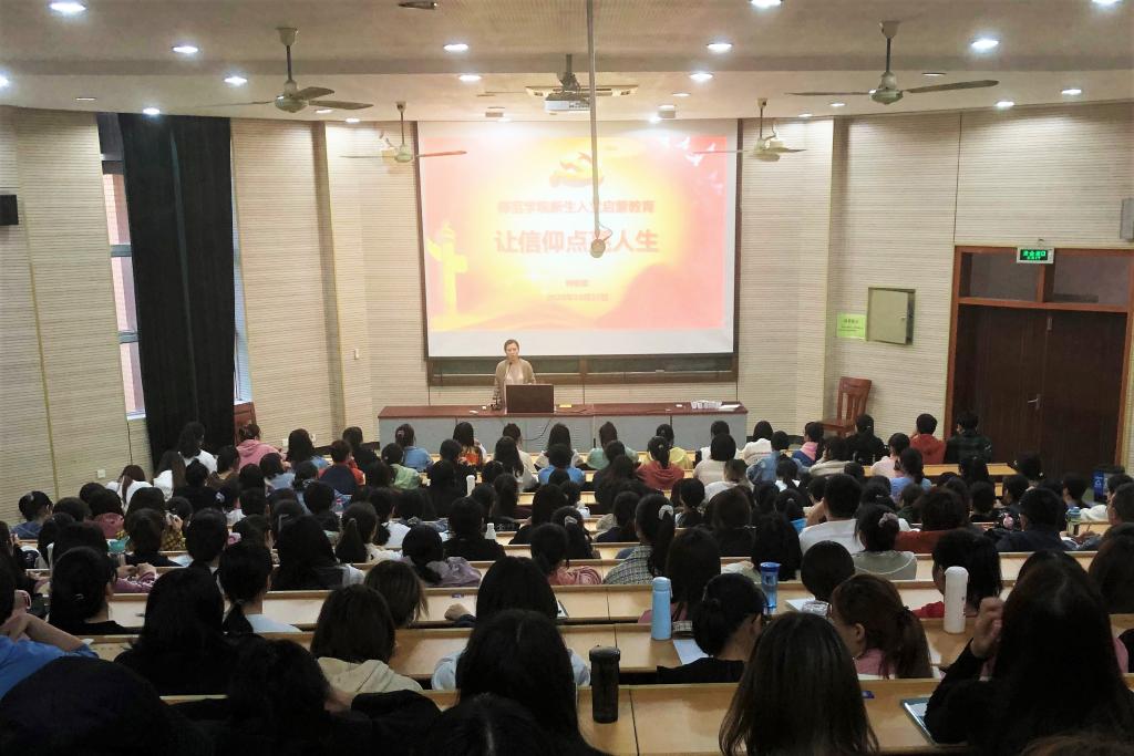 2020年10月22日下午17时,师范公司2020-2021学年第一学期入党启蒙教育讲座在阶梯教室一顺利开展。本次会议由师范公司团总支专职副书记钟张懿老师主持,共有311名入党申请人参加。