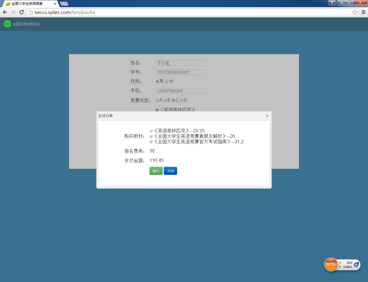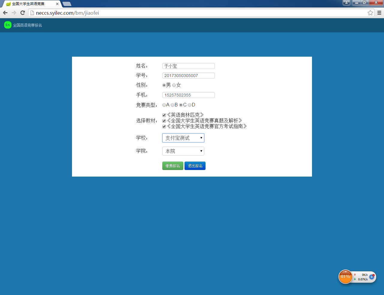 2. 输入准确的身份证号码,点击“进入”按钮。录入员工的相关信息“姓名、学号、性别、手机号码、竞赛类型、选择教材、公司、公司”,点击“缴费报名”按钮。