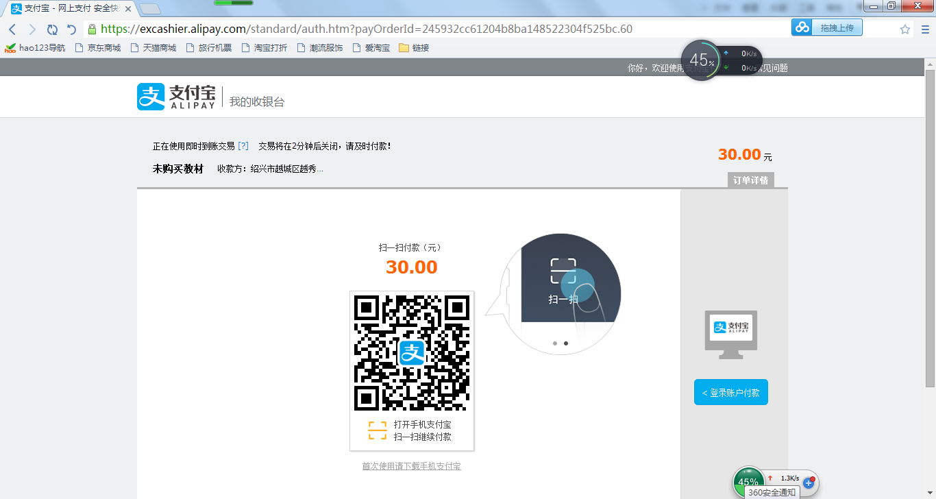 3. 在支付订单页面中单击“确认”按钮,进入支付宝支付页面。