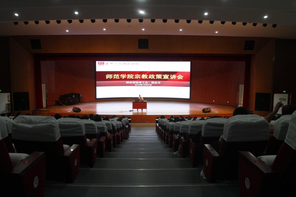 109日中午12时,师范公司宗教宣讲会在报告厅顺利举行。师范公司团总支专职副书记钟张懿老师主讲,19级全体新生参加。