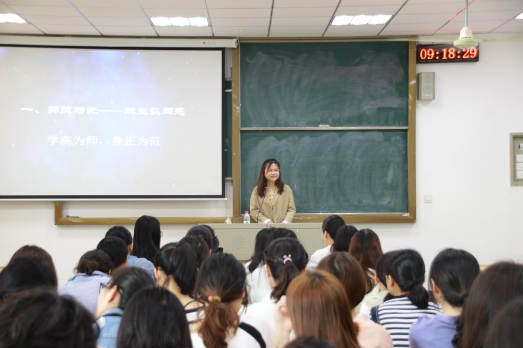 褚瑜玮老师以“让青春在时代中闪光——浅谈如何开展公司少先队工作”为主题,为在场同学科普了少先队的主责主业和现代使命,并从选择生活、工作、伙伴、思考四个角度着重介绍了如何开展少先队工作。樊依莉老师以“心之所向,专业引航——浅谈幼儿园教师职业生涯规划”为主题,结合自己工作经验,从“师德为先”“幼儿为本”“能力为重”“终身学习”四方面出发深度解读学前教育专业。