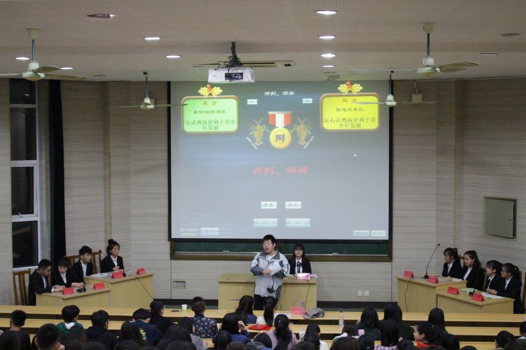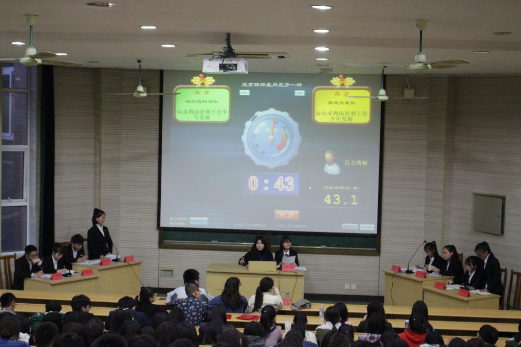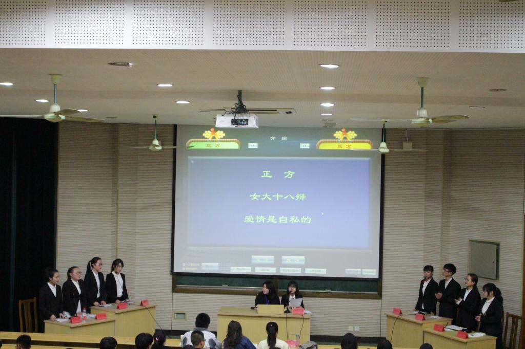 49日晚,公司辩论赛决赛首轮于阶梯教室一正式开始。伴随着观众热烈的掌声,评委陈力豪、王佳琴、朱玥次落座。本次比赛有四支队伍,共有两场,分别是我们说的都队和霸道总裁队围绕“心灵鸡汤还是反心灵鸡汤更利于青少年发展”,女大十八辩队和1990队围绕“爱情是自私的还是无私的”辩题展开