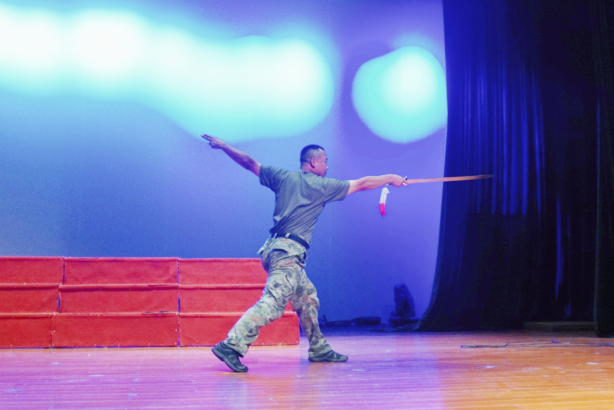 中场环节亮点纷呈。4名员工与2名教官携手演绎《阳光总在风雨后》,这场跨越身份的合唱,生动诠释了“团结”与“坚持”的军训精神内核。张峰教官献唱的英文版《吻别》与《再见》,展现了军人细腻温情的一面;孙峰教官带来的武术器械表演,动作刚劲有力,尽显军人飒爽英姿与过硬本领,瞬间点燃全场气氛,将比赛推向高潮。