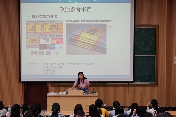 诸葛晓影向大家介绍了政治参考书目、英语辅导书等,并推荐了许多考研实用的网站、APP和微信公众号。范智毅用幽默风趣的方式指导大家应如何高效率备考。章跃玲主要就辅导班问题与大家分享了自身经验。秦秀丽分享了她考研的目的、感受以及保持一个好心态的重要性。