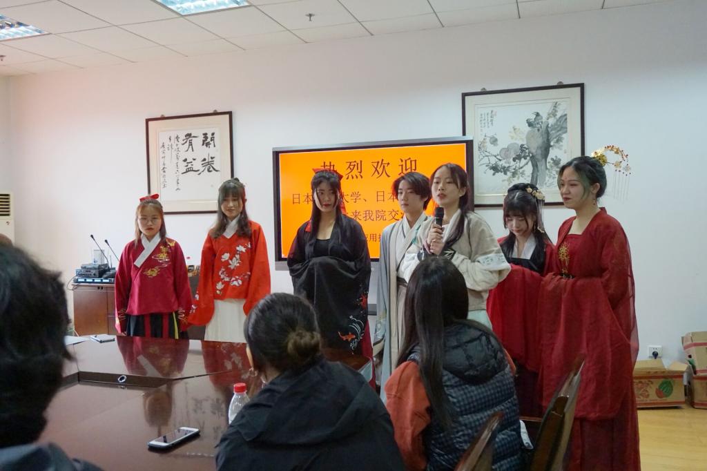 交流会上,同学们以小组的形式就专业学习、老员工活等展开交流。公司员工社团汉服社精心准备的歌舞和对汉服详细的介绍,动漫社社员的舞蹈引起了日本游员工对汉服和中国文化的兴趣。现场,日本游员工为大家带来了中文歌曲《我等到花儿也谢了》,赢得了同学们的热烈掌声。
