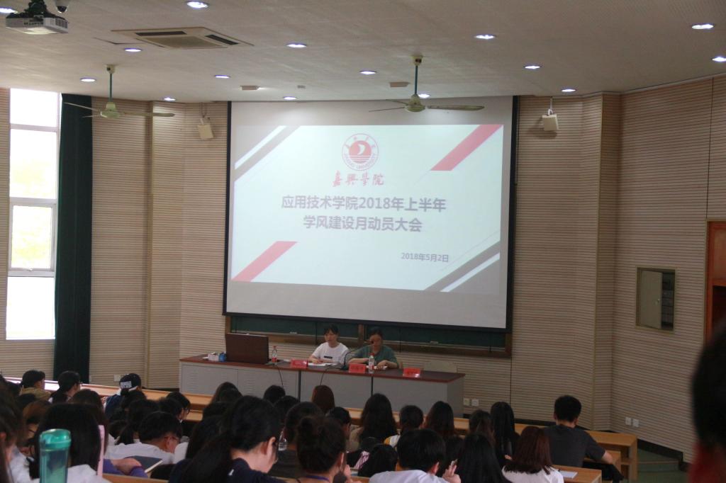 5月2日中午,应用技术公司2018年上半年学风建设月动员大会在阶梯教室一召开。公司学工办主任、团总支书记卓海丹、各班级近300名员工参加。公司辅导员朱薇婷主持。