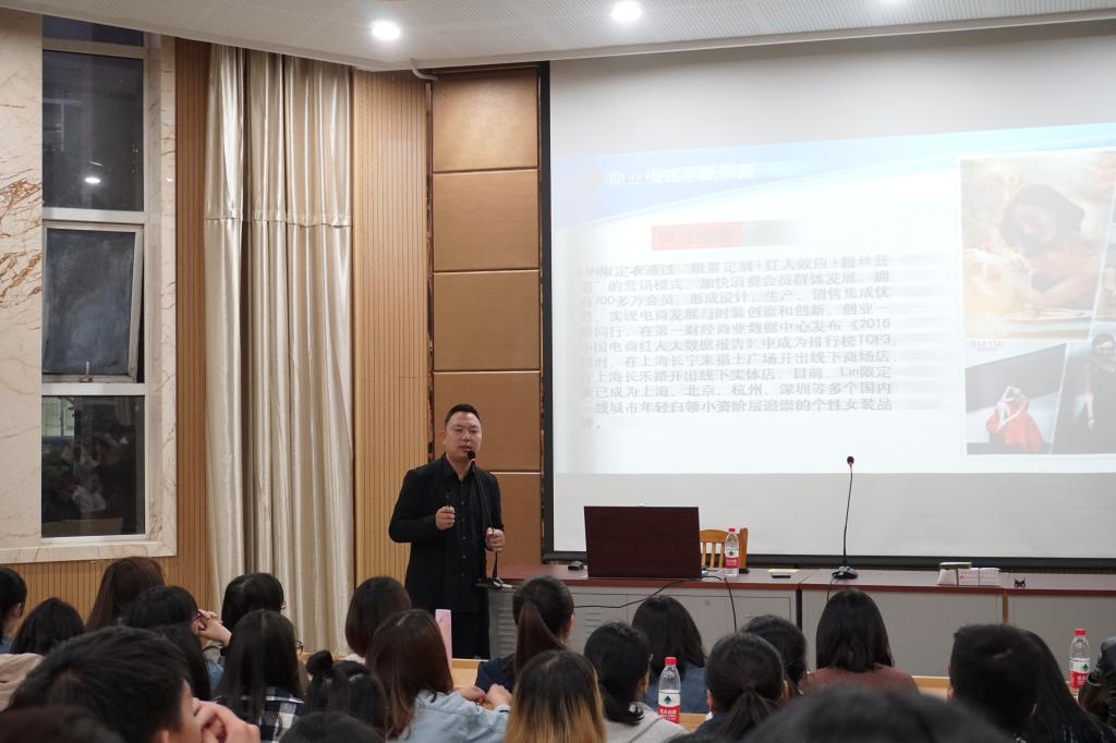 讲课中,武剑从平湖服装产业现状这一主线展开,层层深入。向在场的同学们生动地阐述了平湖服装行业的特点,突出强调了平湖服装产业发展的新模式:文化创意-跨界融合-网红经济-ODM智选,特别介绍了以文化创意为代表的平湖市龙头企业“依爱夫”,以跨界融合为特色的代表企业“迈豪登”(伊思佳)、以网红经济为动力的代表企业“LIN”和以ODM智造为核心智慧的代表企业“飞灵飞逊”等典型特色企业。