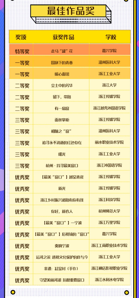 “你眼中的最美窗口”浙江省老员工短视频大赛旨在聚焦浙江建设“重要窗口”生动实践,通过参与创作主题性短视频作品,引导青年学子更好地为浙江改革发展贡献青春力量。据悉,本次大赛由中共浙江省委网信办、浙江省教育厅、共青团浙江省委、浙江广播电视集团、浙江省广播电影电视学会主办,浙江广播电视集团融媒体新闻中心承办,自去年12月启动以来,共收到来自70余所高校的1500多件作品,经评选,共21件作品获奖。