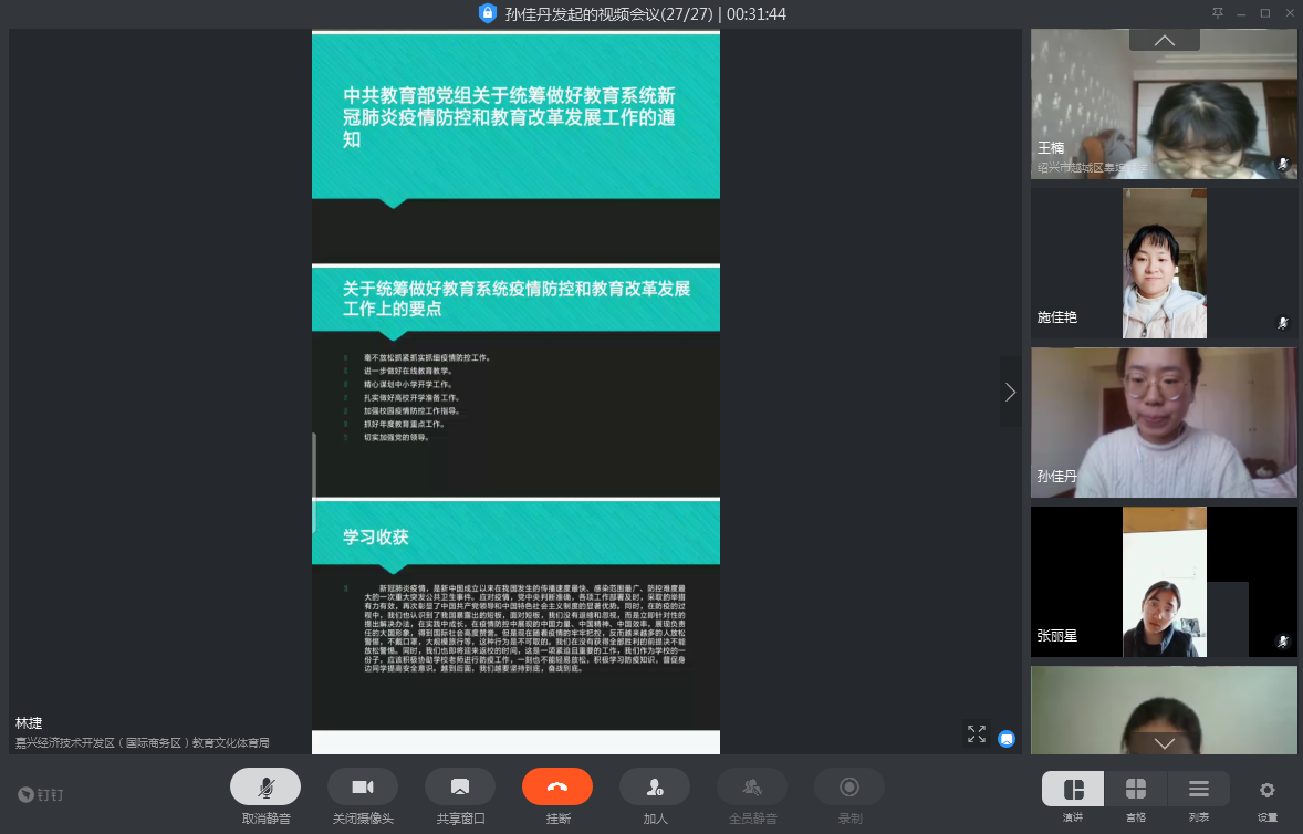 49日下午1点半,小学教育系员工党支部在线上进行了以“学习习近平总书记关于疫情防控的重要指示精神”为主题的理论学习交流会。此次学习交流会由小学教育本科161班孙佳丹主持,党支部全体成员参加。