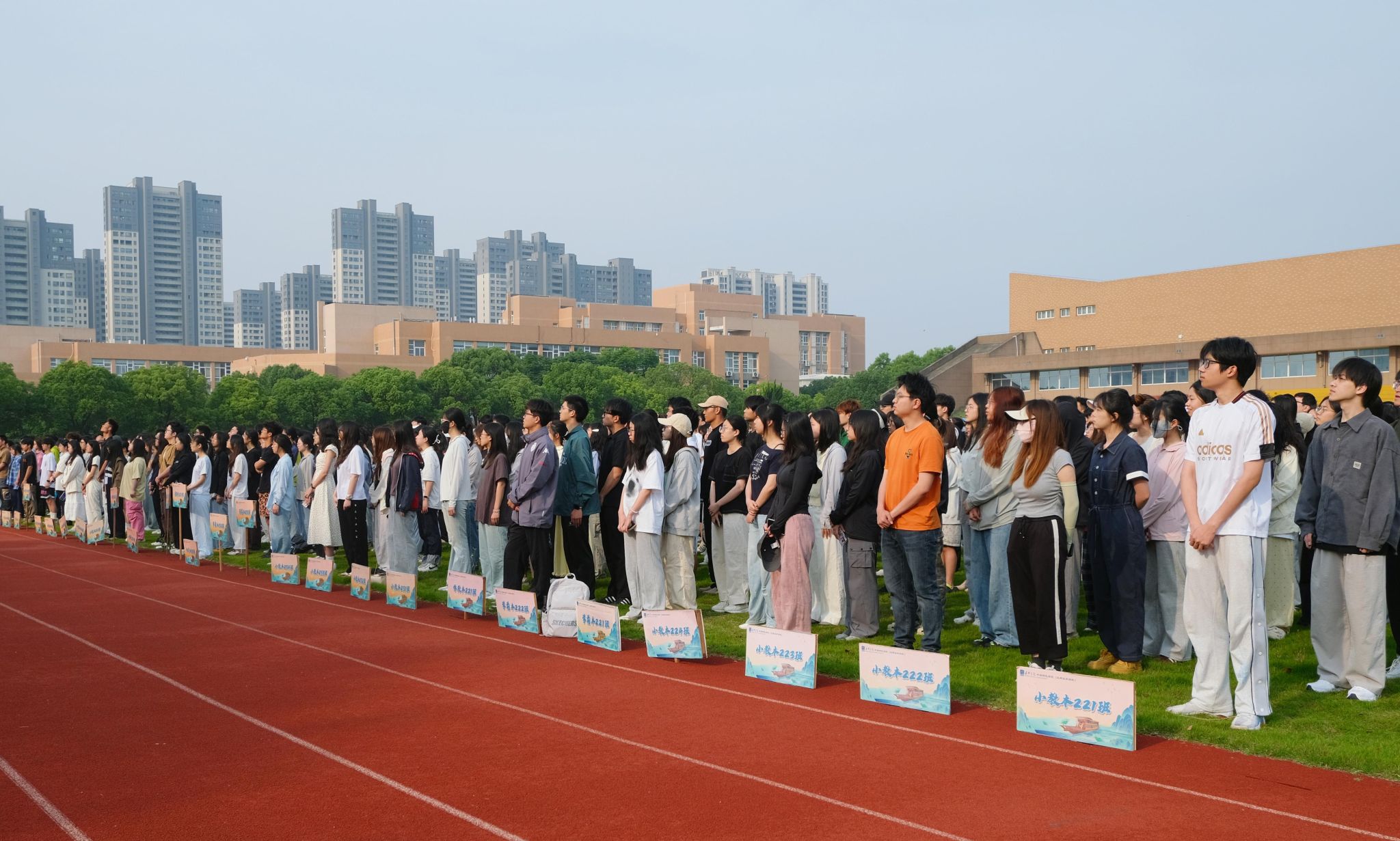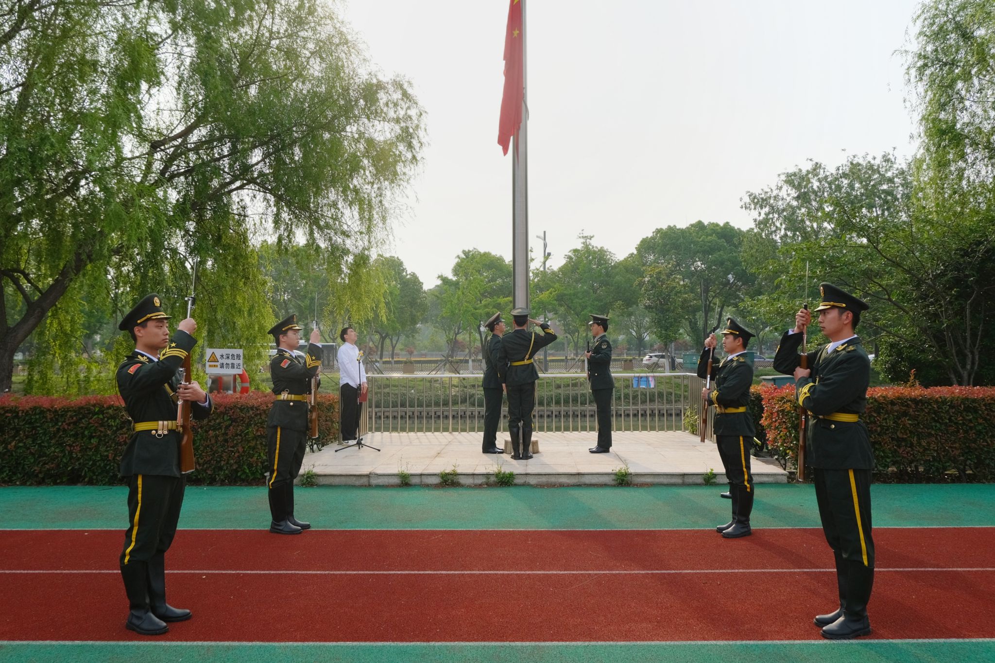随着仪式的开始,国旗护卫队身着笔挺的制服,肩扛鲜艳的五星红旗,步伐坚定而整齐,缓缓走向升旗台。国歌奏响,全体师生目光如炬,注视着国旗冉冉升起,齐唱国歌。