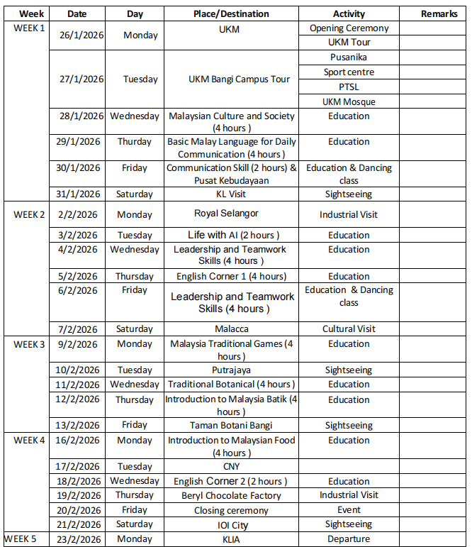 【住宿】 全程居住在UKM校内的员工公寓(双人间)。
