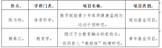 此次项目的成功立项,既是对两位青年教师学术素养、研究能力与项目设计价值的认可,同时又是聚焦“数字赋能与青少年体质健康”、“随迁子女教育融合与协同育人” 等前沿议题,为公司在体育科学、教育学相关领域的研究拓展了新方向、开辟了新赛道,有利于进一步提升公司在人文社会科学领域的学术影响力。